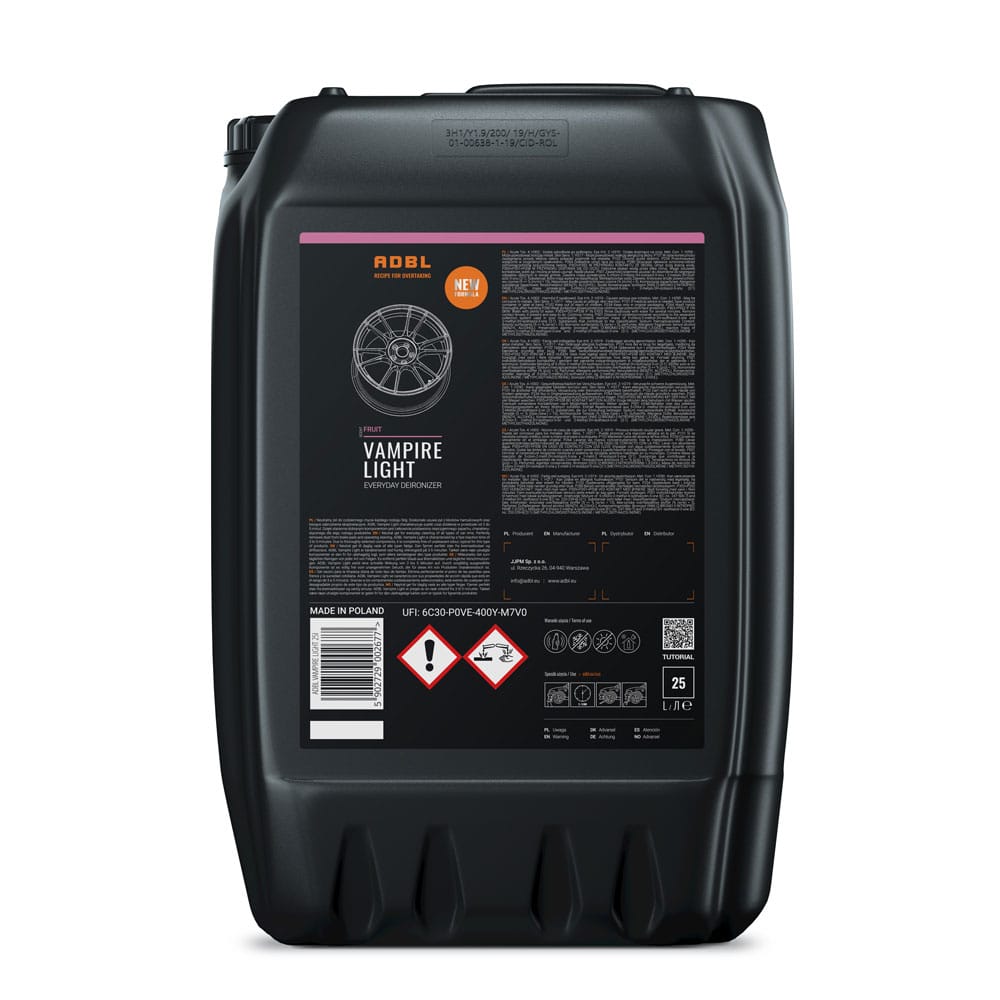 ADBL Vampire Light Everyday Deironizer – neutralny żel do codziennego mycia każdego rodzaju felg. Doskonale usuwa pył z klocków hamulcowych oraz bieżące zanieczyszczenia eksploatacyjne. Posiada formułę minimalizującą nieprzyjemny zapach, charakterystyczny dla tego rodzaju produktów.