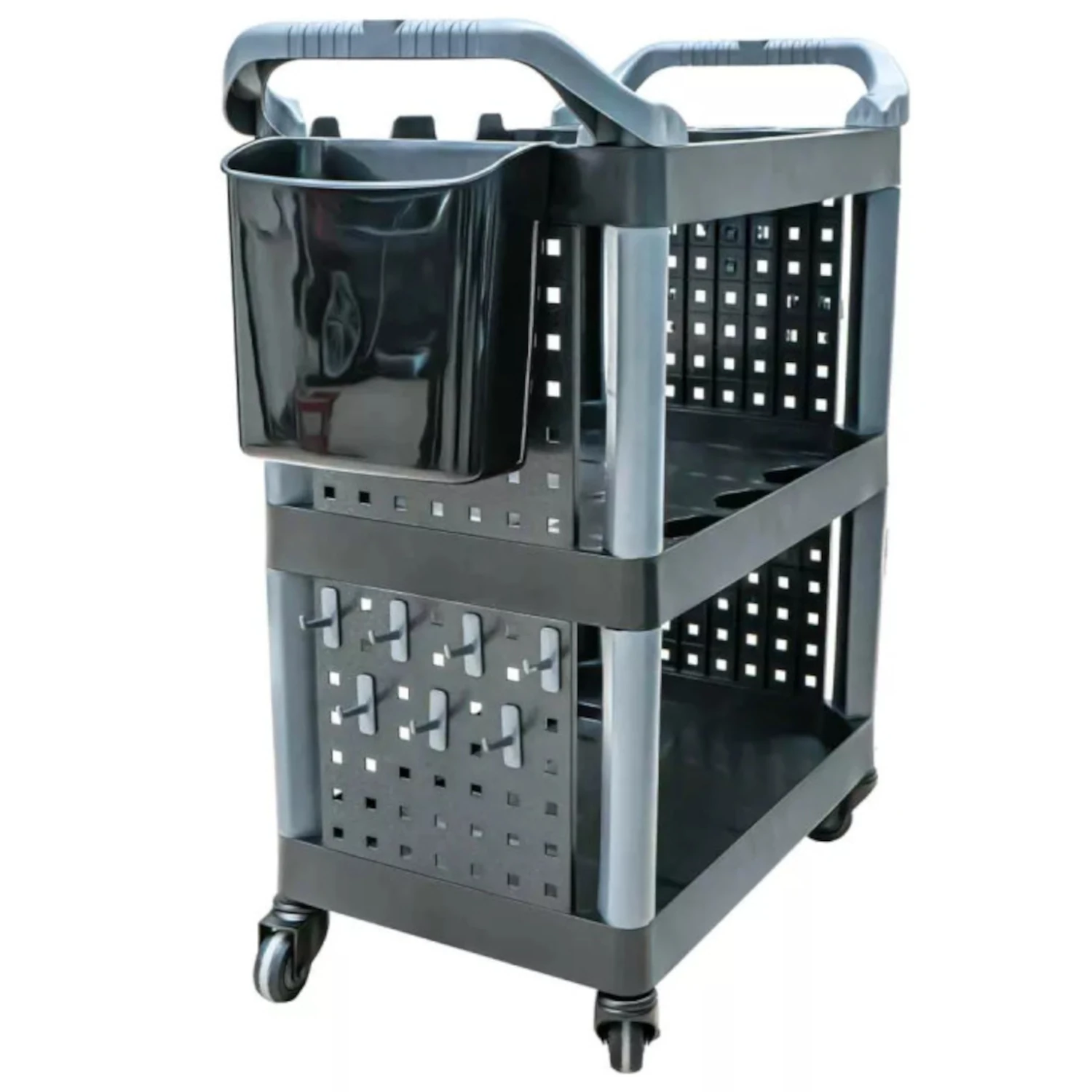 Boczne panele z możliwością personalizacji – zdejmowane haczyki, uchwyty i kosz pozwalają na dostosowanie przestrzeni roboczej do indywidualnych potrzeb.