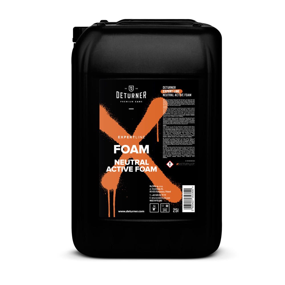 Deturner Expert Line Foam – wysoce skoncentrowana, neutralna piana aktywna, która daję bardzo gęstą pianę o wysokich właściwościach zmiękczających. Rozpuszcza brud i zabrudzenia drogowe pozwalając na bezpiecznie mycie właściwe. Nie uszkadza zastosowanych powłok oraz wosków, szczególnie opartych na naturalnych składnikach co umożliwia regularne stosowanie.
