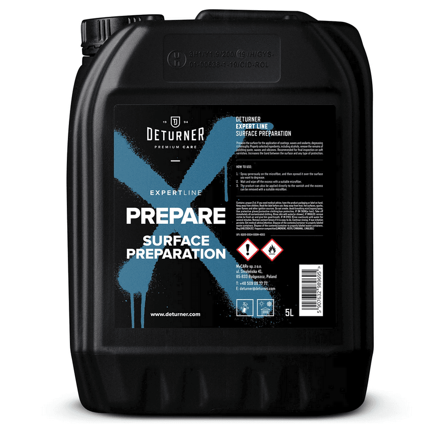 Deturner Expert Line Prepare – to produkt o świetnych właściwościach odtłuszczających, który przygotowuje powierzchnię lakieru do aplikacji powłoki, wosku lub sealantu. Odpowiednio dobrane składniki w tym alkohole, usuwają pozostałości past polerskich, wosków i silikonów. Zalecany do finalnej inspekcji miękkich lakierów. Poprawia wiązanie pomiędzy lakierem a każdego rodzaju zabezpieczeniem.