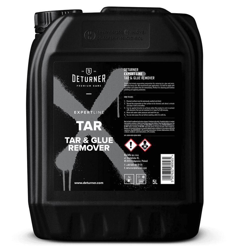 Deturner Expert Line Tar – mocny i wolno parujący preparat do usuwania smoły, kleju oraz żywicy. Potrafi usunąć ciężkie zabrudzenia. Zalecamy stosować punktowo, najlepiej nanosić za pomocą mikrofibry i od razu zbierać zanieczyszczenia. Idealny do oczyszczenia lakieru przed polerowaniem i aplikacją zabezpieczeń.