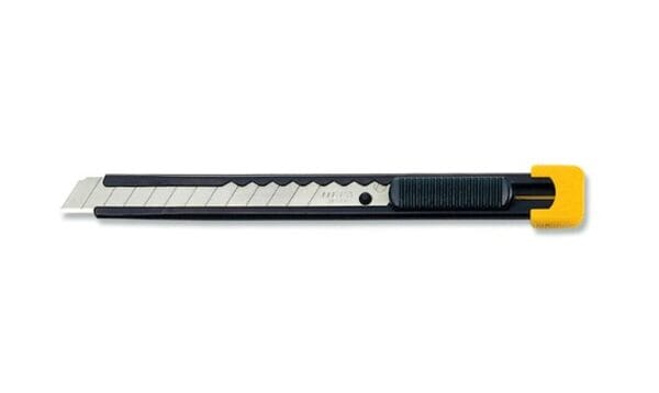 Uniwersalny nóż z ostrzem segmentowym o szerokości 9 mm przeznaczony do cięcia papieru, folii, otwierania opakowań itp. Stalowy korpus o eleganckim, smukłym kształcie, rękojeść zwieńczona żółtą końcówką z tworzywa – do odłamywania zużytych segmentów, ostrze zamocowane w suwaku, który pozwala na łatwe wysuwanie i chowanie ostrza, a równocześnie pewnie blokuje je w ustalonym położeniu.