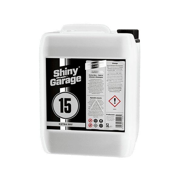 Shiny Garage Extra Dry – to innowacyjny produkt przeznaczony do czyszczenia podsufitki, boczków drzwiowych i wszelkich elementów materiałowych wrażliwych na przemoczenie. Nie wymaga stosowania wody w celu wypłukania, co gwarantuje bezpieczną pracę bez ryzyka odklejenia się czyszczonego materiału. Oparty na technologii sieciowania zabrudzeń: zamyka zanieczyszczenia w cząsteczki i pozwala je bezpiecznie usunąć przy pomocy suchej mikrofibry lub odkurzacza. Nie wymaga stosowania odkurzacza ekstrakcyjnego.
