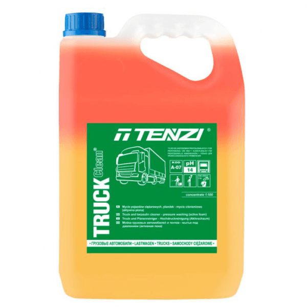 Tenzi Truck Clean – najskuteczniejszy na rynku środek do mycia ciężarówek. Mycie plandek, pojazdów ciężarowych, aktywna piana. Silny środek alkaliczny o szerokim zakresie zastosowania; przeznaczony do mycia skrajnie zabrudzonych powierzchni twardych, odpornych na alkalia; możliwość wykorzystania do mycia pojazdów, maszyn i urządzeń w przemyśle motoryzacyjnymi ciężkim, a także w rolnictwie; charakteryzuje się wysoką skutecznością. Unikać stosowania środka na nagrzanych lub nasłonecznionych powierzchniach!