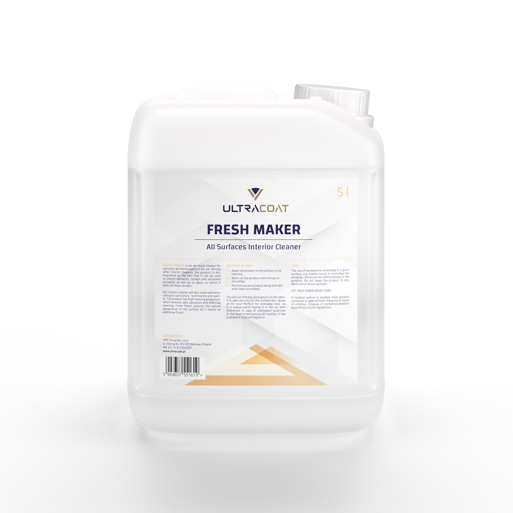 Ultracoat Fresh Maker – to wszechstronny środek czyszczący do pielęgnacji wszystkich wewnętrznych elementów samochodu. Spośród innych cleanerów do wnętrz, produkt wyróżnia to, że możemy stosować go zarówno na elementach z tworzyw, kokpicie i elementach lakierowanych jak również na szybach, na których nie pozostawia smug.